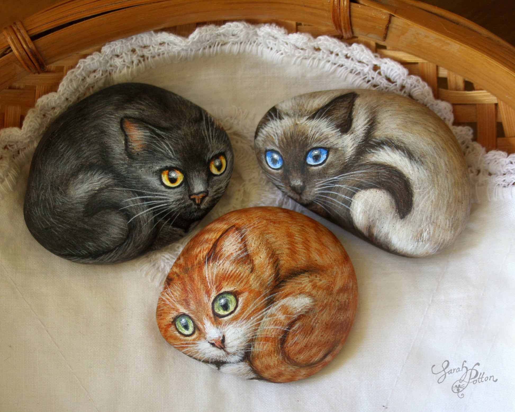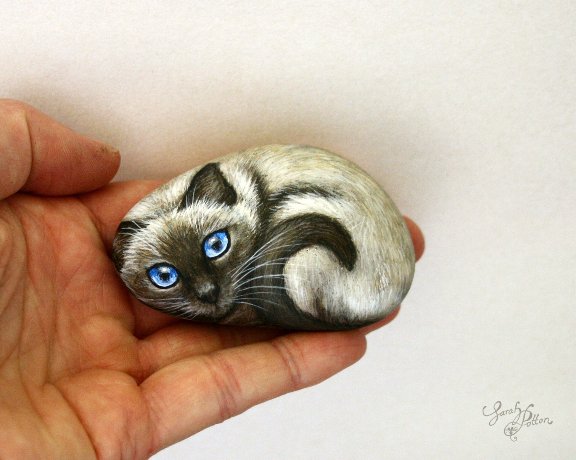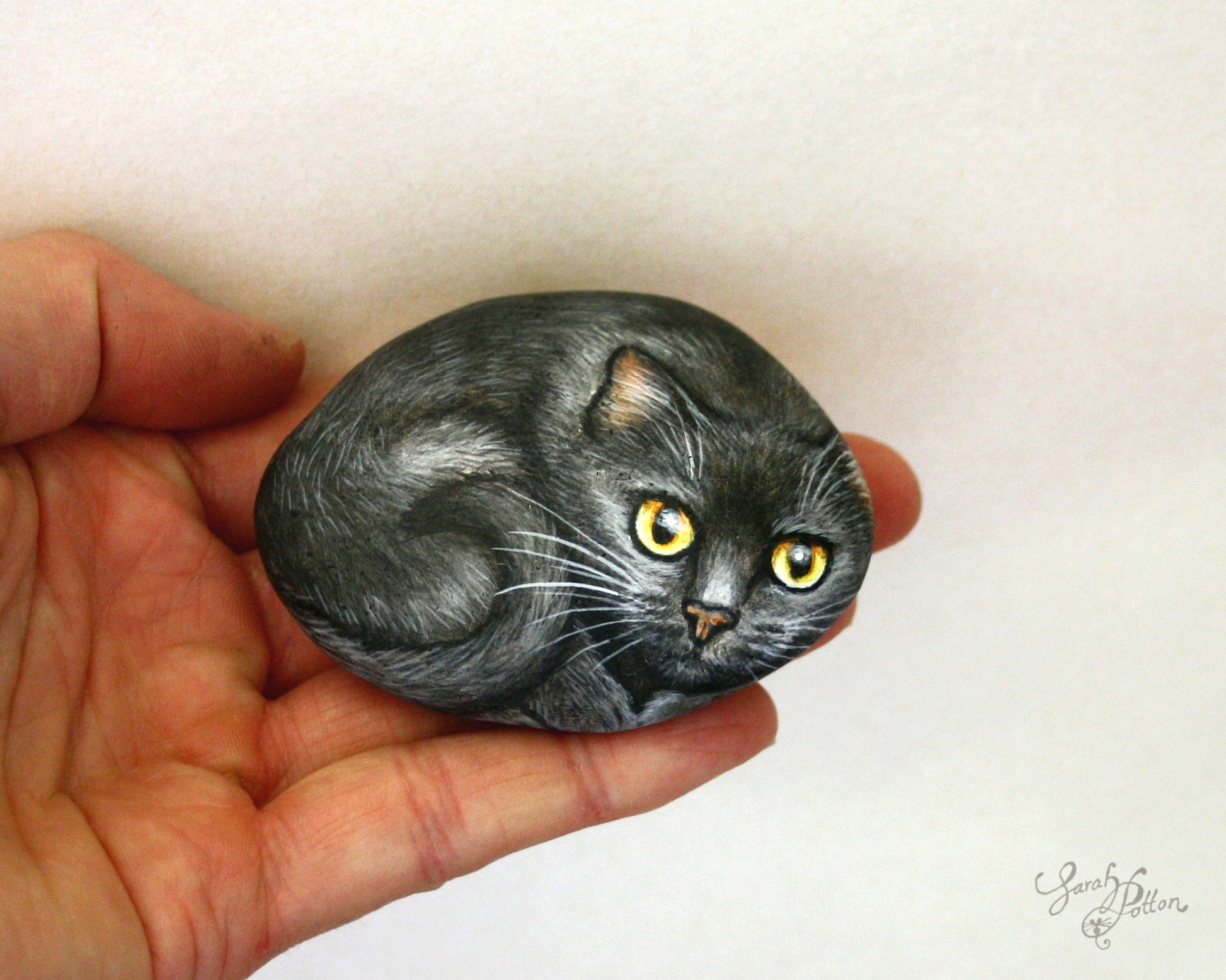 I take commissions for pet portraits on stones. Provide me with photos of your cat or dog and I will paint a lifelike rendition of your pet on a rock, in finest detail.